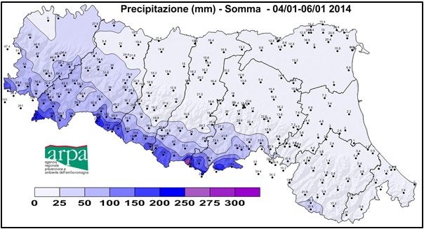 Pensate che, sempre in Emilia-Romagna, tra il 4 e il 6 gennaio si sono verificate precipitazioni “liquide” superiori a 200 mm in 2 giorni (vedi figura qui a sinistra), mentre la quota dello zero termico (ovvero il livello al quale la temperatura è di 0°C) si manteneva superiore ai 1500 metri (a gennaio !!). Le piogge dei primi di gennaio, sommate a quelle di una decina di giorni fa, in alcune località dell’Appennino assommano a più di 500 mm, vale a dire poco meno di un terzo di quello che dovrebbe piovere in un anno in quelle località. La cosa interessante è che questo inverno ha l’aspetto di un discreto autunno, con anche qualche tocco d’estate (!), se si pensa che durante gli eventi di piena fluviale del 4-6 gennaio si sono verificati, sempre in Emilia Romagna, fenomeni temporaleschi (!?) notturni. Temporali con tuoni e fulmini, a gennaio 2014. Sempre a gennaio, le temperature minime (medie decadiche e mensili) sono attorno a 0°C, cioè almeno 5 gradi in media più elevate della “norma”, come nel caso della città di Bologna, ad esempio. In questo caso la “norma” considerata è il periodo 1991-2008, periodo questo che è già risultato parecchio più caldo rispetto al clima 1961-90 (vedete qui)
